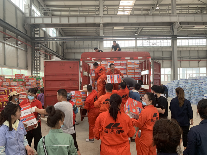 在暴雨过后,集团员工自发组成志愿者团队,连续多日参与新乡市高新区对外接收救援物资的分派点进行物资搬卸。