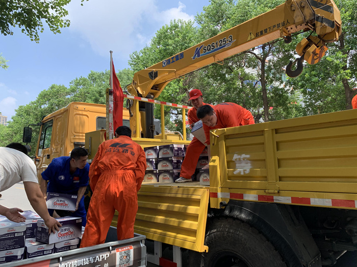 在暴雨过后,集团员工自发组成志愿者团队,连续多日参与新乡市高新区对外接收救援物资的分派点进行物资搬卸。